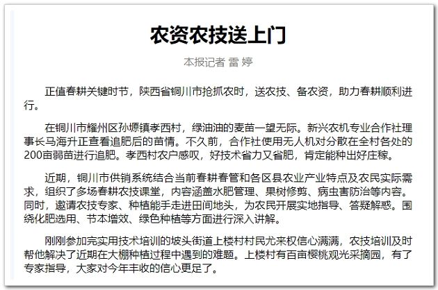 銅川市供銷合作社黨組成員、副主任王婧表示,當(dāng)?shù)毓膭?lì)各區(qū)縣供銷合作社以農(nóng)資供應(yīng)為抓手,充分調(diào)動(dòng)各方資源,推廣“農(nóng)資供應(yīng)+農(nóng)技培訓(xùn)+農(nóng)產(chǎn)品購銷+農(nóng)業(yè)社會(huì)化服務(wù)”的一體化為農(nóng)服務(wù)模式,將服務(wù)觸角延伸到耕、種、管、收等農(nóng)業(yè)生產(chǎn)全過程。銅川市供銷合作社還充分發(fā)揮農(nóng)資供應(yīng)主渠道作用,引導(dǎo)農(nóng)資經(jīng)營主體加強(qiáng)市場(chǎng)調(diào)查與分析預(yù)測(cè),把握市場(chǎng)趨勢(shì),多渠道組織貨源,做好化肥、農(nóng)藥、農(nóng)膜等春耕生產(chǎn)物資的采購、調(diào)運(yùn)和供應(yīng)工作。