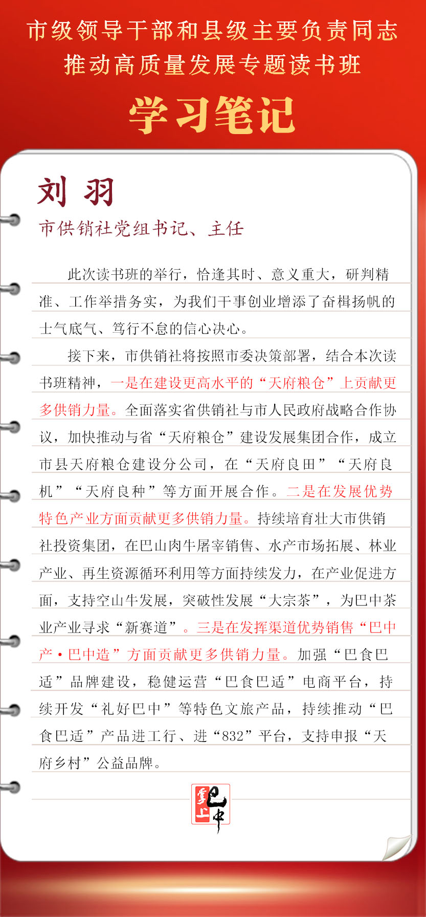 接下來,市供銷社將按照市委決策部署,結(jié)合本次讀書班精神,全面落實(shí)省供銷社與市人民政府戰(zhàn)略合作協(xié)議,加快推動(dòng)與省“天府糧倉”建設(shè)發(fā)展集團(tuán)合作,成立市縣天府糧倉建設(shè)分公司,在“天府良田”“天府良機(jī)”“天府良種”等方面開展合作。持續(xù)培育壯大市供銷社投資集團(tuán),在巴山肉牛屠宰銷售、水產(chǎn)市場拓展、林業(yè)產(chǎn)業(yè)、再生資源循環(huán)利用等方面持續(xù)發(fā)力,在產(chǎn)業(yè)促進(jìn)方面,支持空山牛發(fā)展,突破性發(fā)展“大宗茶”,為巴中茶業(yè)產(chǎn)業(yè)尋求“新賽道”。加強(qiáng)“巴食巴適”品牌建設(shè),穩(wěn)健運(yùn)營“巴食巴適”電商平臺,持續(xù)開發(fā)“禮好巴中”等特色文旅產(chǎn)品,持續(xù)推動(dòng)“巴食巴適”產(chǎn)品進(jìn)工行、進(jìn)“832”平臺,支持申報(bào)“天府鄉(xiāng)村”公益品牌。